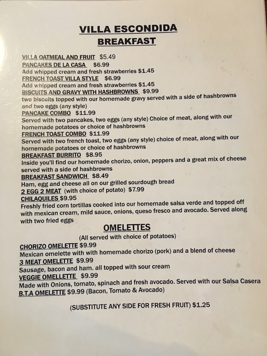 Villa Escondida Restaurant and Bar Menu